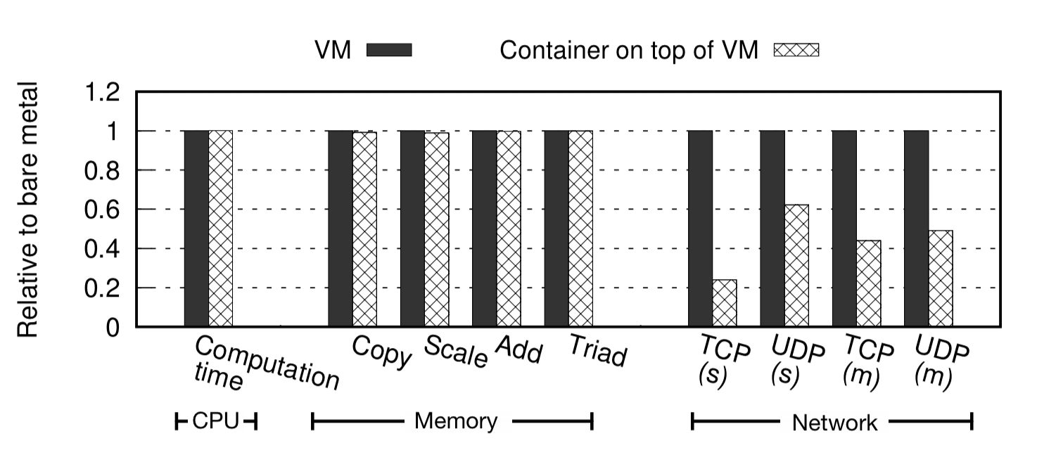 -> Computing 성능이나 memory intensive workload는 베어메탈에 비해 성능저하가 없음을 알 수 있으나 VM 네트워크에 비해 컨테이너 네트워크의 경우 성능 저하가 심함을 알 수 있다.